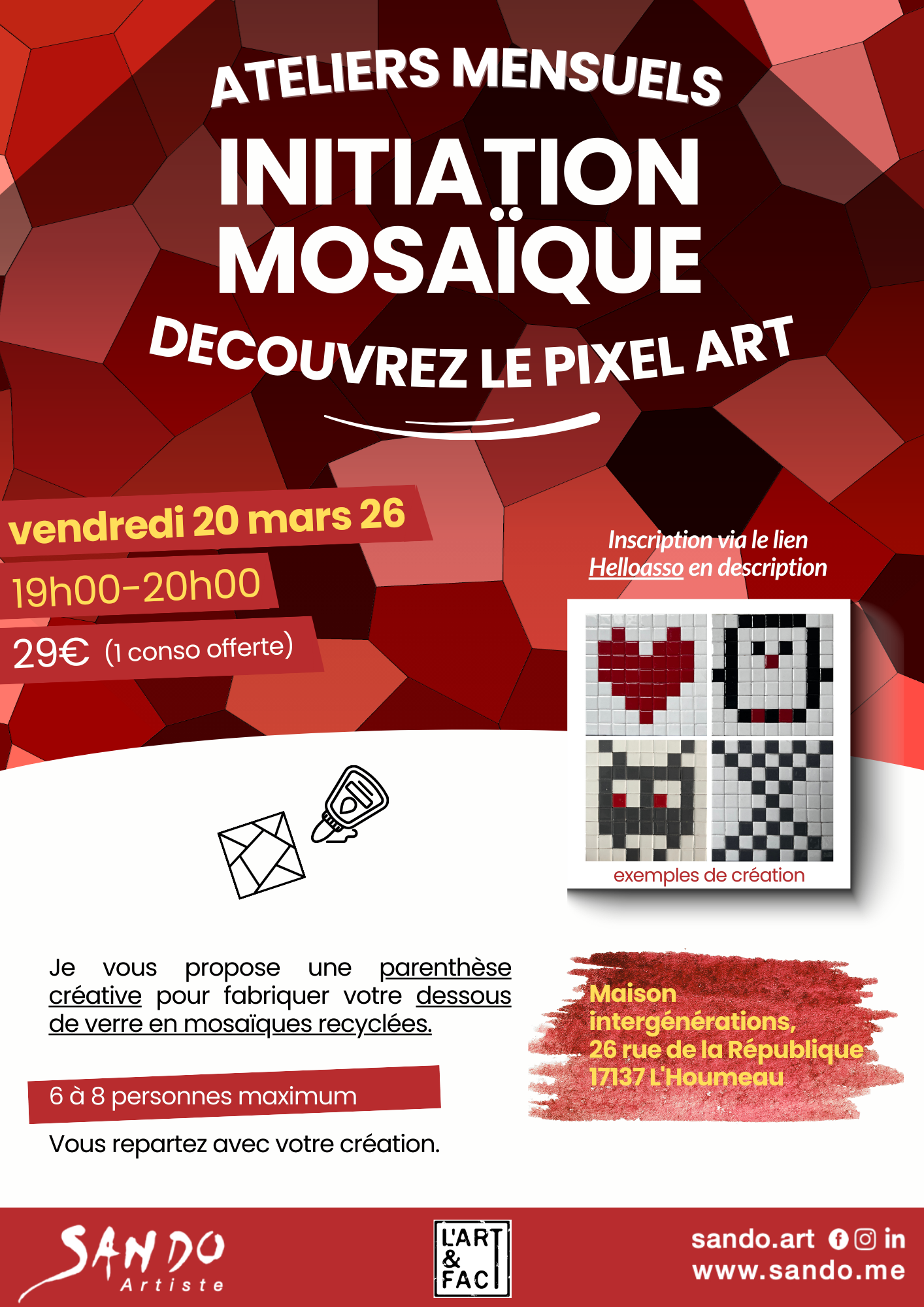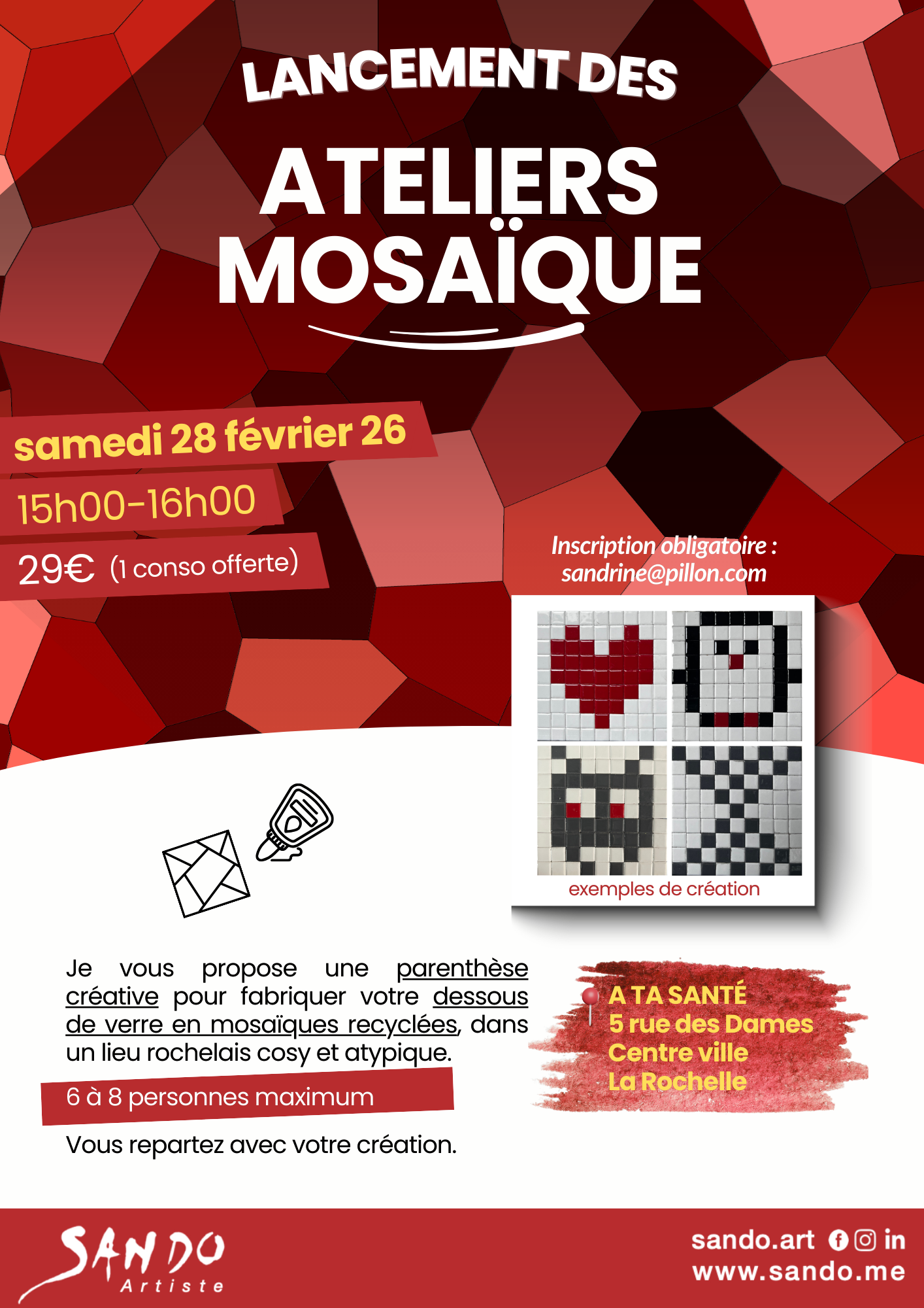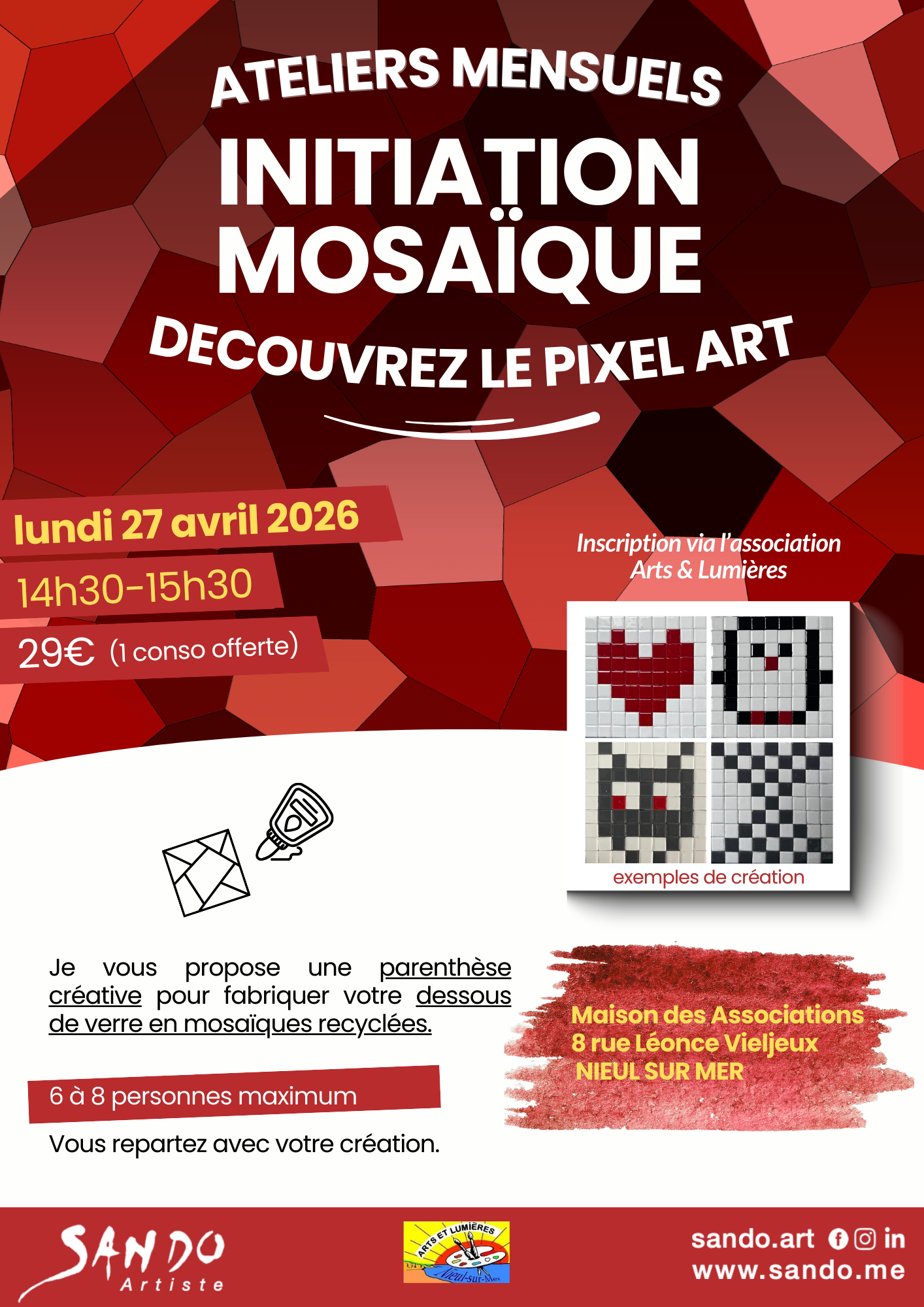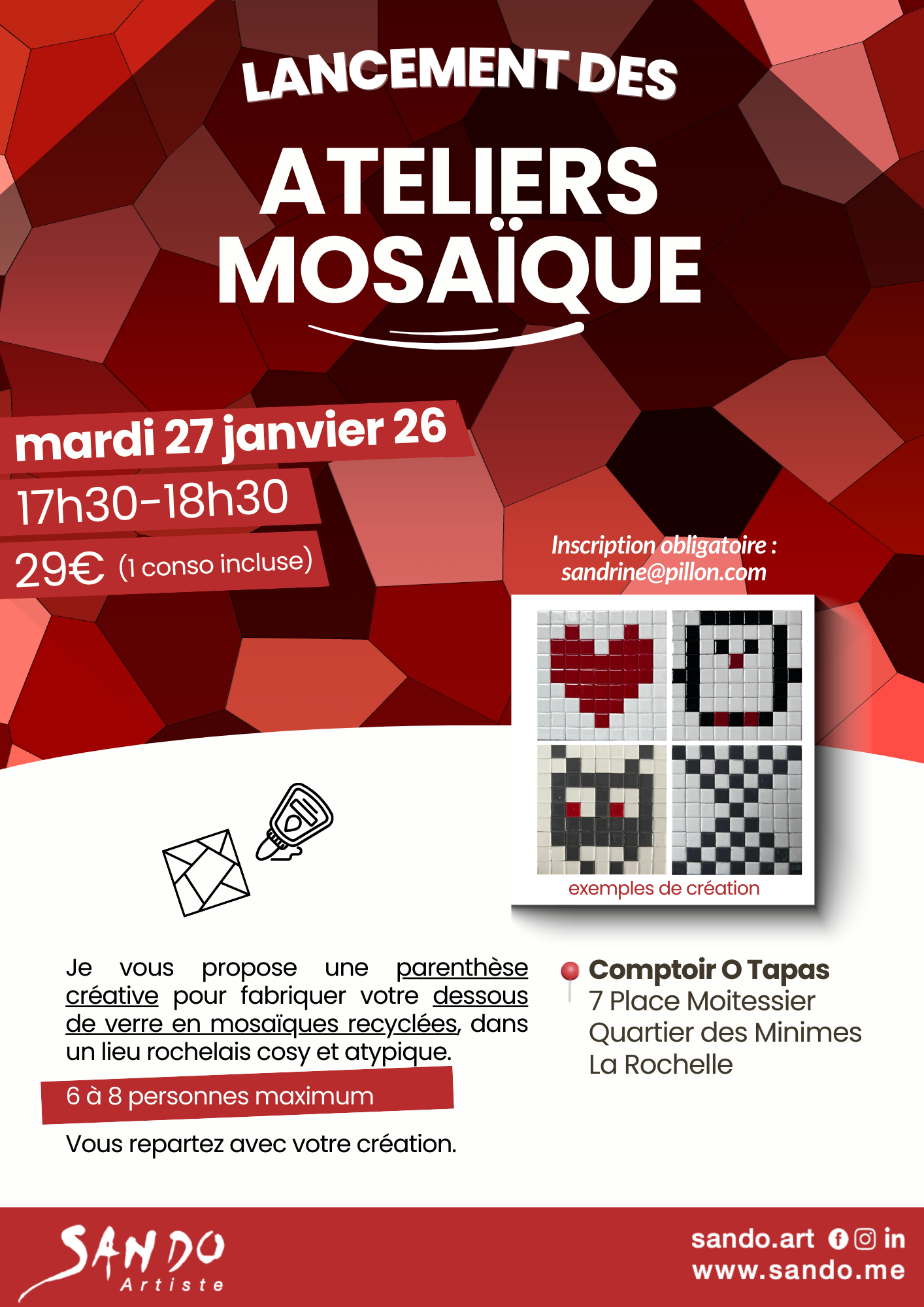 Alors, si vous avez envie de vous faire plaisir et de créer un objet en mosaïque, je vous propose chaque mois un atelier d’une heure, dans un lieu de l'agglomération de la Rochelle.